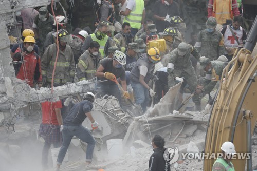앞서 19일 오후 1시 14분께 수도 멕시코시티에서 남동쪽으로 123㎞ 떨어진 푸에블라 주(州) 라보소 인근에서 규모 7.1의 지진이 났다. 진원의 깊이는 51㎞로 관측됐다.