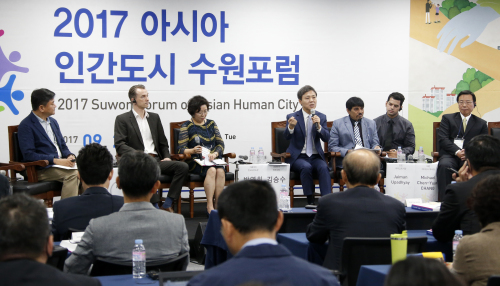 | 김승수 전주시장(왼쪽 4번째)이 26일 경기도 수원시 더함파크에서 열린 ‘2017 아시아 인간도시 수원포럼’에서 성매매 집결지라는 오명을 딛고 문화재생을 통해 최근 인권·예술 공간으로 변모하고 있는 선미촌 문화재생 사례를 발표하고 있다. |