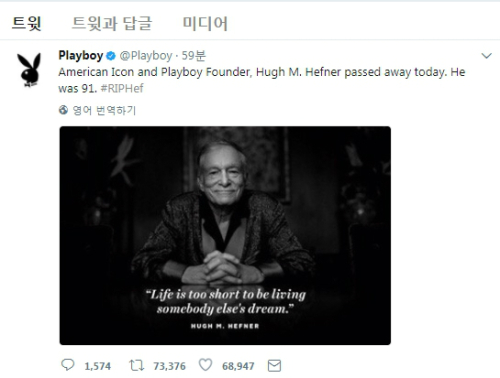 '플레이보이' 측은 28일 공식 트위터를 통해 "미국의 아이콘, 플레이보이 창업자 휴 헤프너가 오늘 사망했다(American Icon and Playboy Founder, Hugh M. Hefner passed away today. He was 91.)"는 글을 게재했다.