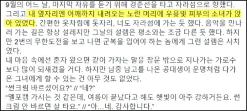 옷차림을 보고 단번에 같은 페스티벌을 간다고 생각한 A씨는 혼자 왔으면 같이 가자는 말을 건네려 했지만 조금 있으면 군인 신분이 될 자신의 처지가 떠올라 포기했다.