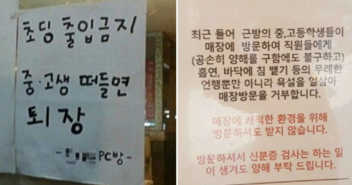 공개된 사진 속 한 PC방에는 '초딩 출입금지. 중고생 떠들면 퇴장'이라는 문구가 부착돼있다.