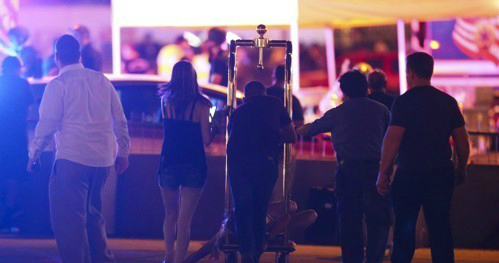 | 1일 밤(현지시간) 미국 라스베이거스에서 총격 발생 후 이송 중인 부상자의 모습. AP=연합뉴스 |