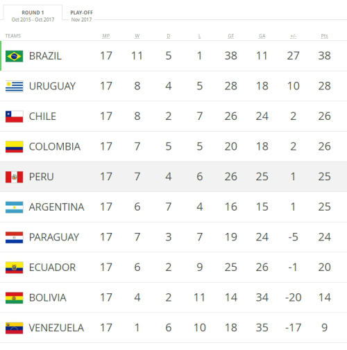 | 11일 오전 8시 30분(한국시간) 기준2018 러시아 월드컵 남미지역 순위표. 사진=FIFA 홈페이지 캡처 |