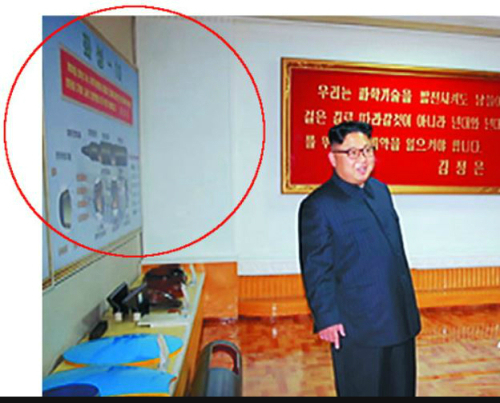 | 지난 8월 23일 김정은 노당당 위원장이 국방과학원을 시찰하던 모습. 현황판에 3단식 화성 13형 로켓도면(원안)을 의도적으로 노출했다. 정보관계자들은 북한이 2단식이던 화성 14형(사거리 1만3000㎞)을 3단식으로 개량, 사거리를 더욱 늘렸을 것으로 분석했다. |