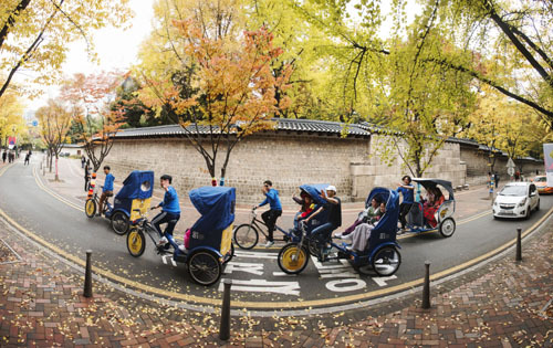 | 인력거 투어 ‘아띠 라이더’가 정동길 투어를 진행하고 있다. 아띠 라이더는 서울 북촌 일대를 인력거로 달리며 관광객에게 지역 문화·역사 해설을 제공한다. 아띠 라이더 제공 |