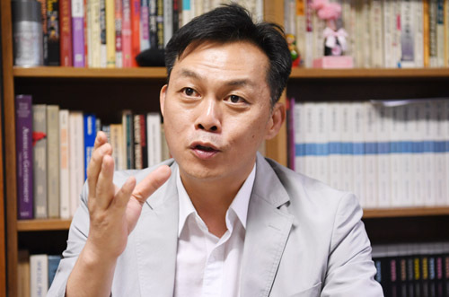 | 이건호 이화여대 커뮤니케이션·미디어학부 교수가 지난달 26일 서울 서대문구 대현동 이대 연구실에서 스트레이트 기사의 중요성을 강조하고 있다. 남제현 기자 |