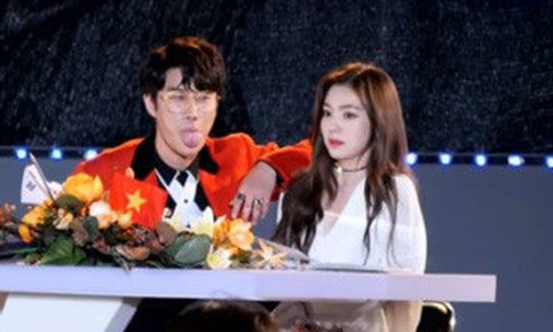 영상 속 산이(사진 왼쪽)는 아이린(사진 오른쪽)의 어깨에 팔을 올리고 관객석의 팬들을 향해 '메롱' 포즈를 취했다. 아이린은 예상치 못한 산이의 행동에 화들짝 놀란 표정을 지었다.