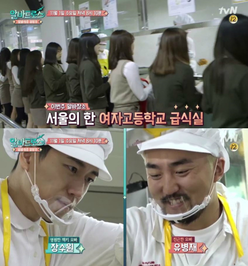 30일 공개된 tvN 예능 프로그램 '알바트로스'의 예고 영상에는 여고를 찾은 장수원과 유병재가 급식실 아르바이트로 변신해 직접 배식을 하는 장면이 공개됐다.