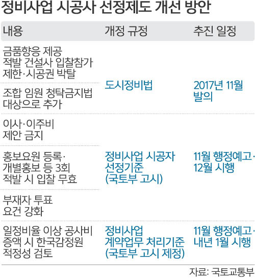 국토부, 정비사업 시공사 선정제 개선 / 이주비·초과이익 부담금 대납도 금지 / 금품·향응 제공 땐 입찰 제한·시공권 박탈 / 개별 홍보, 등록된 건설사 요원 한해 허용