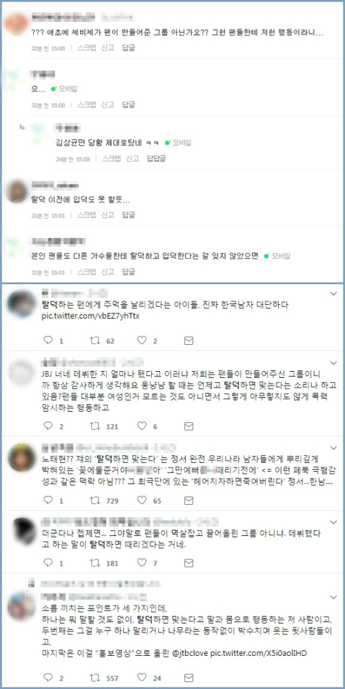 네티즌들은 "너무 무섭다. 트라우마 있는 제 입장에서는 영상보다가 눈 질끈 감았어요", "JBJ는 팬이 만들어준 그룹 아닌가요? 팬들한테 저런 행동이라니", "탈덕 이전에 입덕도 못 할듯" 등의 반응을 보였다.
