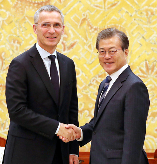 | “글로벌 파트너” 문재인 대통령이 2일 오후 청와대에서 옌스 스톨텐베르그 북대서양조약기구(NATO·나토) 사무총장을 접견하기에 앞서 악수를 나누고 있다. 청와대사진기자단 |