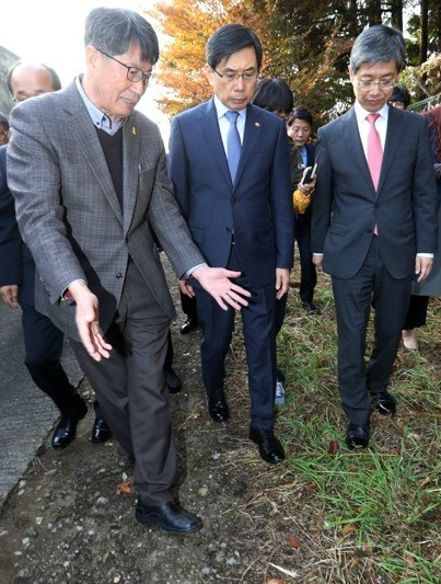 | 박상기 법무부 장관(가운데)이 지난 3일 옛 광주교도소의 5·18민주화운동 행방불명자 암매장 추정지를 찾아 현장을 살펴보고 있다. 왼쪽은 김양래 5·18기념재단 상임이사, 오른쪽은 김호철 광주고검장. 연합뉴스 |