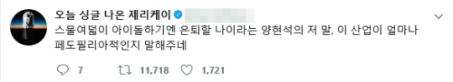 이에 제리케이는 6일 오전 자신의 트위터에 "스물여덟이 아이돌하기엔 은퇴할 나이라는 양현석의 저 말, 이 산업이 얼마나 페도필리아적인지 말해주네"라는 글을 남겼다.