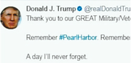 그러면서 부인 멜라니아와 진주만 공습 당시 일본의 공격을 받고 파괴돼 침몰한 애리조나함 위에 세워진 ‘애리조나 기념관에 헌화’하는 영상을 첨부했다.