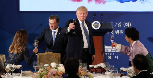 | 문재인 대통령 내외와 도널드 트럼프 미국 대통령 내외가 7일 청와대 영빈관에서 열린 국빈만찬에서 건배하고 있다. 이날 만찬주는 수작업을 통해 감미료 없이 쌀과 누룩, 물만으로 빚은 ‘풍정사계(楓井四季) 춘(春)’이었는데, 트럼프 대통령만 콜라를 마신 것으로 전해졌다. 사진=연합뉴스 |