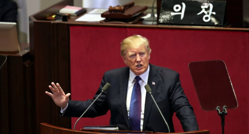 8일 도널드 트럼프 미국 대통령은 서울 국회의사당 본회의장에서 펼친 국회 연설에서 굳건한 한미동맹을 강조하고 북한의 핵·미사일 도발 중단을 촉구했다.