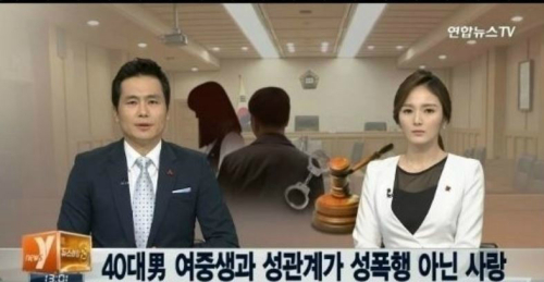 | 40대 기획사 대표에게 성폭행 당했다는 여중생 사건에 대해 2014년 11월 대법원이 '성폭행이 아니라 연인사이의 사랑'이었다는 취지로 파기환송, 사회적 논란을 야기했다. 2013년부터 4년여 동안 이어져 왔던 재판은 재상고심에서 '무죄'가 최종 확정됐다. 사진=연합뉴스 TV |