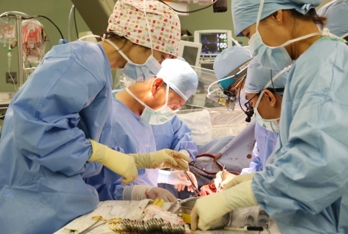 | 지난달 21일 박승일 서울아산병원 폐이식팀 교수(왼쪽 두 번째)가 국내 첫 생체 폐이식 수술을 집도하고 있다. 서울아산병원 제공 |