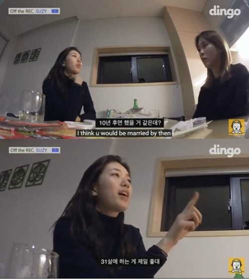 이후 수지는 10년 후를 묻는 친구에게 "아마 결혼을 했을 것 같다"고 대답했다. 이어 "내가 점을 봤는데 31살에 하는 게 가장 좋다더라"고 말했다.