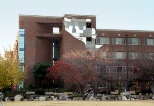 | 15일 포항에서 발생한 지진으로 한동대학교의 한 건물 외벽이 떨어져 나가 있다. 사진=연합뉴스 |