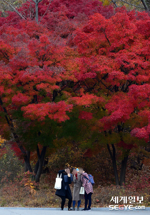 | 쌀쌀한 날씨를 보인 17일 서울 이화여대에서 학생들이 노랗고 붉게 물들어가는 교정에서 사진을 찍으며 추억을 쌓고 있다. |