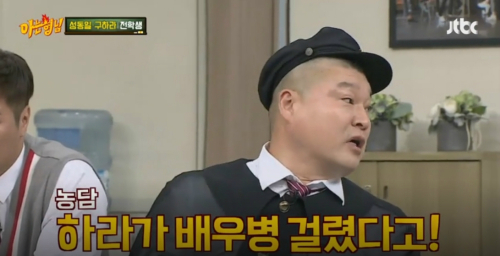 이날 강호동은 "구하라가 아팠다고 소문이 났다. 배우병 걸렸다고 하더라"며 "배우 이미지를 위해 말도 천천히 했다"고 말했다. 이에 구하라는 "아니야"를 연발하며 억울함을 표시했다.