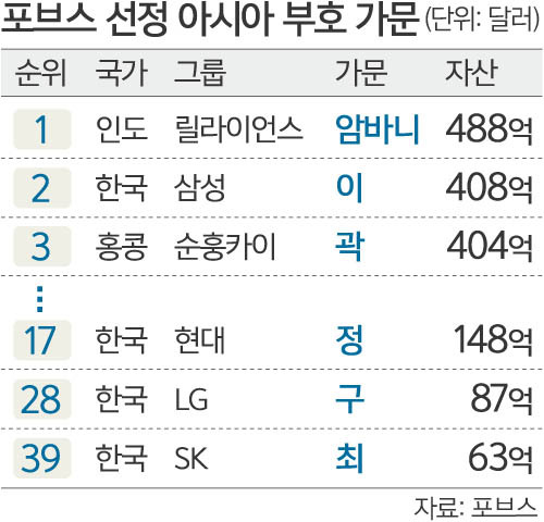 한국에서는 삼성 외에 현대의 정씨 가문(148억달러·17위), LG의 구씨 가문(87억달러·28위), SK의 최씨 가문(63억달러·39위) 등이 포함됐다. 최씨 가문은 올해 처음으로 50위 내에 진입했다. 포브스는 SK하이닉스가 도시바 반도체 지분 투자 등을 추진하며 회사 주가가 두 배 뛰었다고 소개했다.