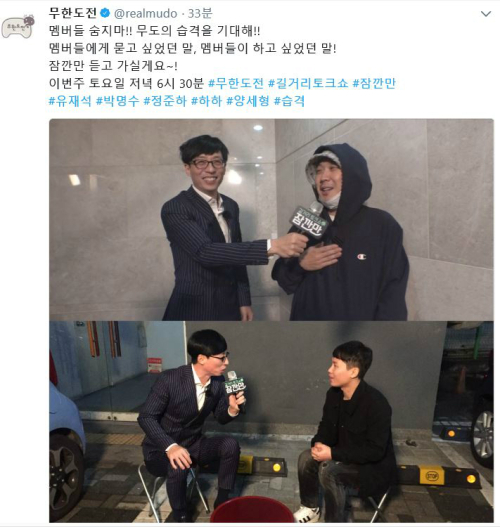 무한도전 공식 트위터에는 마이크를 든 방송인 유재석과 인터뷰이가 된 하하의 사진과 함께 "멤버들 숨지마!! 무도의 습격을 기대해!!"라는 글이 게시됐다.