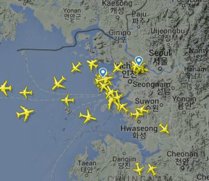 이날 오후 한 네티즌은 온라인커뮤니티에 "현 시각 인천, 김포 상황"이라는 제목의 게시물을 게재했다. 해당 사진은 ‘Flightradar24’ 기능을 이용해 스마트폰 화면을 캡처한 것으로, 해당시간 공항에 착륙하지 못하고 상공을 떠도는 항공기들의 모습이 담겼다. 수많은 비행기들이 착륙하지 못하고 상공을 뱅글뱅글 돌며 대기중인 모습이 흥미롭다. ‘Flightradar24’는 항공기 항로 및 위치를 실시간으로 확인할 수 있는 앱이다.