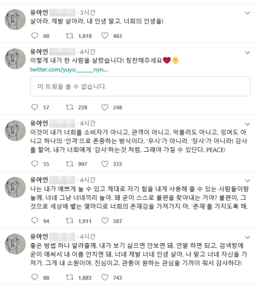 그러면서 "이것이 내가 너희를 소비자가 아니고, 관객이 아니고, 악플러도 아니고, 잉여도 아니고 하나의 '인격'으로 존중하는 방식"이라며 "'무시'가 아니라 '장사'가 아니라! 감사를 할어. 내가 너희에게 '감사'하는 것처럼. 그래야 가질 수 있단다. PEACE!"라고 다소 난해해 보일 수 있는 내용의 문장을 덧붙이기도 했다.