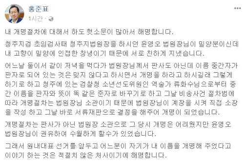 28일 홍 대표는 자신의 페이스북에 "원내대표 선거를 앞두고 어느 분이 자기가 내 이름을 개명해주었다고 얘기하는 것은 적절치 않은 처사"라며 "내 개명 절차에 대해서 하도 헛소문이 많아서 해명한다"고 개명에 이르게 된 까닭을 알렸다.