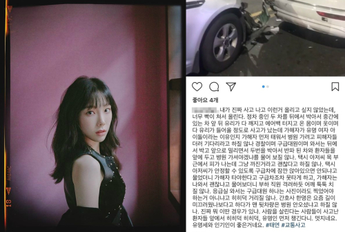 | 지난 28일 오후 서울 강남구 도로에서 2중 추돌사고를 낸 소녀시대 태연(왼쪽 사진). 교통사고 피해자라고 주장하는 누리꾼이 인스타그(오른쪽 사진)램을 통해 사고 당시 현장에 있던 구급대원과 응급실 간호사가 가해자인 태연을 우선시하는 태도를 보였다고 지적했다. 사진=태연 인스타그램, 인터넷 커뮤니티 |