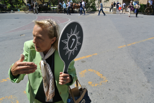 | 나이가 지긋한 금발의 가이드가 활기찬 목소리로 관광객을 불러 모으고 있다. |