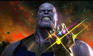 이미지 속 타노스는 우주를 다룰 수 있는 힘을 가진 아이템인 인피니티 건틀릿을 착용한 채 미소짓고 있다.