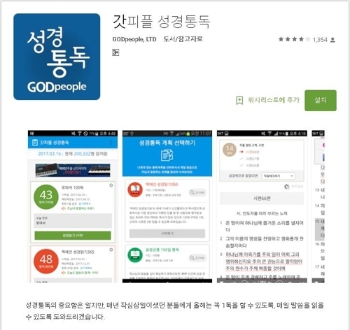 | 구글 플레이 스토어에 등록된 갓피플 성경통독 앱의 캡처 사진. 이 앱 자체는 정상이지만 이와 똑같이 생긴 변형 악성코드 앱이 최근 퍼지고 있어 주의가 요망된다. 연합뉴스 |