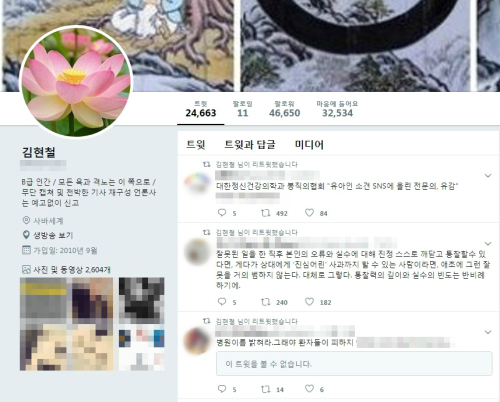 마지막으로 가장 최근엔 대한정신건강의학과 봉직의협회가 유아인에 대한 소견을 올린 자신에 대해 유감의 뜻을 밝혔다는 기사를 리트윗했다.