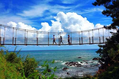 | 동해안의 수려한 자연경관과 경주 양남 주상절리를 감상하며 걸을 수 있는 파도소리길에 세워진 구름다리를 관광객들이 건너고 있다. 경주시 제공 |