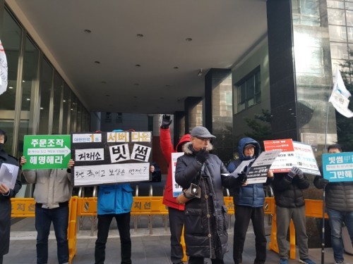 '빗썸 서버다운 집단소송 모집' 카페 운영자들 10여명은 이날 빗썸을 운영하는 서울 역삼동 비티씨코리아 사무실 앞에서 집회를 열고 "빗썸 대표는 사죄하고 대책마련을 공개하라"고 촉구했다.