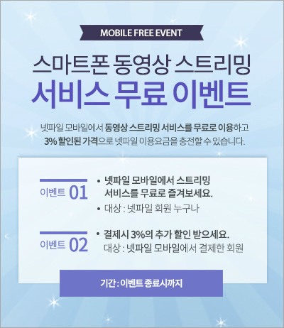넷파일 회원이면 누구나 다양한 장르의 동영상 스트리밍 서비스를 모바일 사이트를 통해 무료로 이용할 수 있다. 또한, 모바일 홈페이지에서 결제한 회원은 3%의 추가할인을 받을 수 있다. 무료이용 이벤트의 자세한 내용은 넷파일 홈페이지를 통해 확인 가능하다.