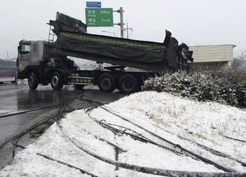 7일 오전 7시 40분께 충북 제천시 강제동 화물차 차고지에서 나오던 25t 덤프트럭의 적재함이 도로가 전깃줄에 걸렸다.