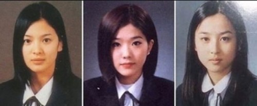 | '은광여고 3대 얼짱'으로 불렸던 (왼쪽부터) 송혜교, 이진, 한혜진의 고교시절 졸업사진. 사진=인터넷 커뮤니티 캡처 |