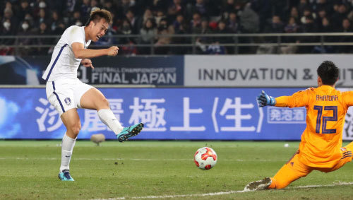 출발은 깔끔하지 못했다. 경기 시작 직후인 전반 3분 일본의 고바야시 유(30·가와사키 프론탈레)에게 페널티킥 골을 허용했다. 그러나 한국은 곧 전열을 정비했다. 지난달 평가전에서부터 갈고 닦아온 4-4-2 기반의 역습 전술이 살아나며 공수가 안정되기 시작한 것. 장현수(26·FC도쿄), 윤영선(29·상무)으로 구성된 중앙수비가 탄탄히 중원을 지키는 가운데 왼쪽 풀백 김진수(25·전북), 오른쪽 풀백 고요한(29·FC서울)이 부지런히 일본 측면을 헤집었고 결국 측면 공격에서 동점골이 나왔다. 전반 13분 왼쪽 측면을 파고든 김진수가 올린 크로스를 김신욱이 골 지역 정면에서 헤딩슛으로 연결해 일본의 골망을 흔들었다.