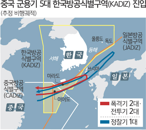 군은 오전 10시2분 중국 군용기 5대가 KADIZ에 접근하는 것을 포착하고 F-15K와 KF-16 전투기 편대를 긴급 출격시켜 KADIZ 이탈 시까지 동향을 감시했다. 중국 군용기가 비행한 이어도 남방 상공은 한·중·일 3국 방공식별구역이 겹치는 곳이다. 지난 1월 9일에도 폭격기와 전투기 등 중국 군용기 10여대가 이어도 남방 KADIZ를 침범한 바 있다.