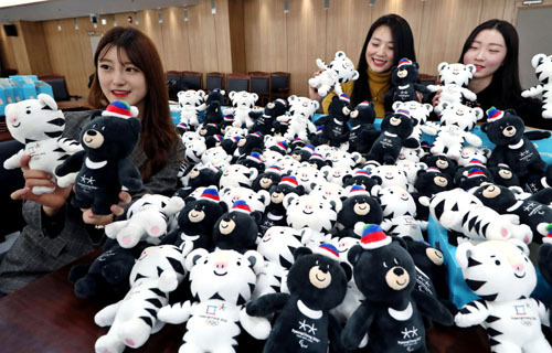평창 동계올림픽 개막을 50일 앞둔 21일 대전 동구청 직원들이 올림픽 마스코트인 수호랑과 반다비 인형을 들어 보이며 환하게 웃고 있다. 동구청은 평창 동계 오륜 붐업 차원에서 각 부서에 마스코트 인형을 나눠줬다.
