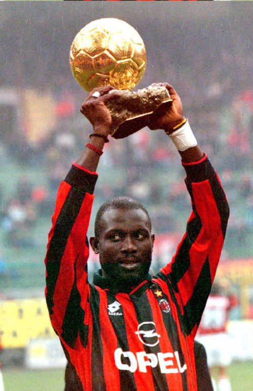 | 21년 전 웨아 1996년 1월 이탈리아 프로리그 세리에A의 AC밀란 소속 선수이던 웨아가 골든볼을 들고 있는 모습. 밀란·몬로비아=AFP연합뉴스 |