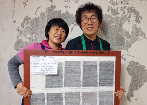 | ‘세서미각의 달인’ 유비빔(오른쪽)·김연수씨 부부가 271쪽의 분량의 ‘소크라테스의 변명’을 다이어리 9쪽에 옮겨 적은 것을 들어보이고 있다. 김동욱 기자 |