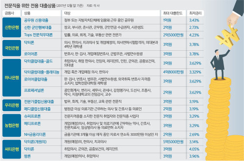 특히 하나은행의 닥터클럽대출은 개업 혹은 개업이 예정된 의사와 한의사를 대상으로 최대 4억8000만원까지 대출이 가능하다. 최저금리는 3.329%(이하 지난해 말 기준)다. 또 하나 프로페셔널론은 공인회계사, 세무사, 건축사, 지정된 대학교 전임강사, 교수 등 전문직으로 분류되는 직업군을 대상으로 최대 억원까지 최저금리 3.629%로 대출이 가능하다.