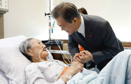 | 문재인 대통령(오른쪽)이 4일 오전 서울 서대문구 연세대 병원을 찾아 일본군 위안부 피해자인 김복동 할머니의 손을 잡고 위로의 말과 함께 쾌차할 것을 기원하고 있다. 청와대 제공 |