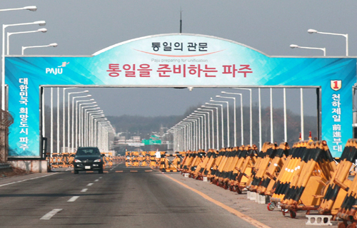 | ‘통일의 관문’ 달리는 자동차 북한이 오는 9일 남북 고위급회담 개최를 수락한 5일 회담이 열리는 판문점으로 향하는 경기 파주시 문산읍 통일대교에서 ‘통일의 관문’ 아래로 차량이 이동하고 있다. 파주=연합뉴스 |