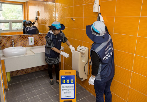 ‘서울시 여성안심보안관’들이 서울의 한 여자화장실에서 몰래카메라가 설치됐는지 점검하고 있다.